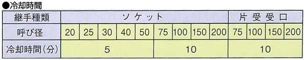 融着終了後、表の冷却時間を加えた時刻を継手表面に油性ペン等で記入してください。冷却時間終了後、クランプを取り外してください。